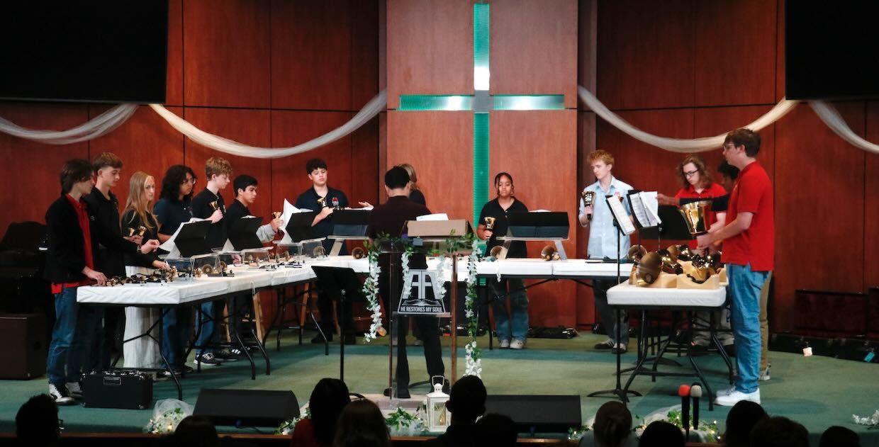 This week's Music Wednesday Chapel featured handbell director, Mr. Daniel Cerna, who shared how bells have historically been used to praise God, evolving from large church bells rung for special occasions. He explained that each handbell corresponds to a specific piano note, with players in a handbell choir responsible for certain tones. Andrews Academy’s handbell ensemble, Resound, performed three pieces during the service.