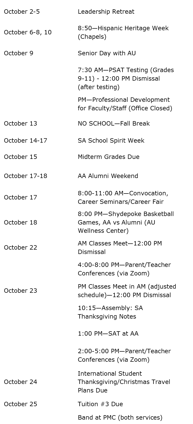 Next week during chapels, we will celebrate Hispanic Heritage. Chapel will start five minutes early, at 8:50 AM on Monday - Wednesday, and Friday. (Thursday is PSAT Testing for grades 9-11, and seniors will be at AU.)