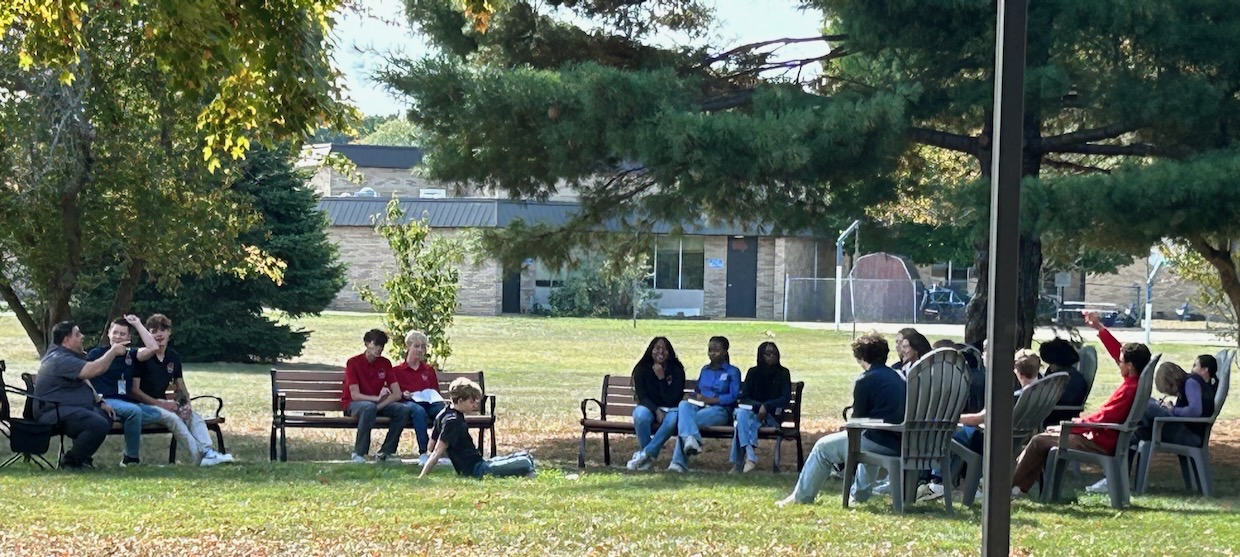This fall has treated us to a stretch of beautiful, sunny days—warm and mostly dry—perfect for taking learning beyond the classroom walls. A number of classes have taken advantage of the weather by heading out to the park benches behind the school near the pine tree, turning outdoor spaces into places for thoughtful dialogue and discussion.