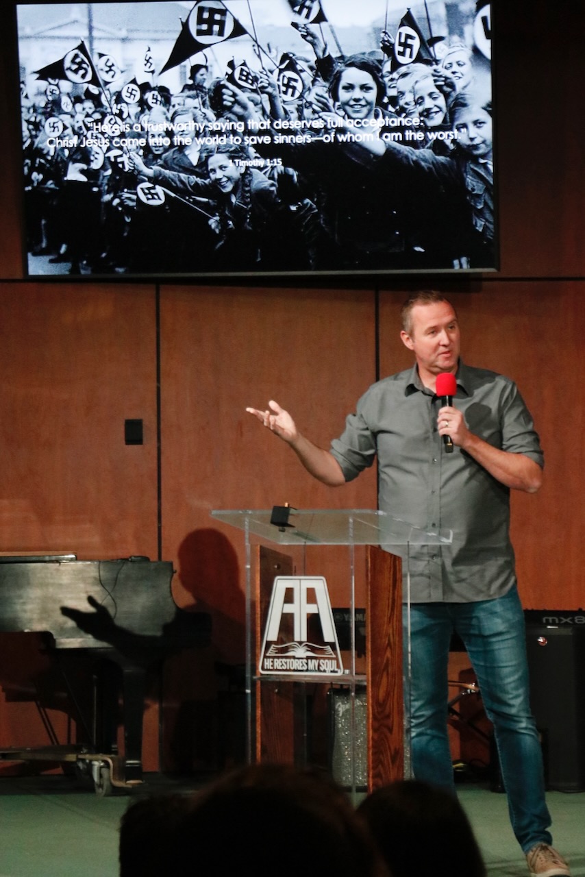 Mr. Andrew von Maur—architect and parent of two Academy students—spoke at Tuesday's assembly on 1 Timothy 1:15, emphasizing that Jesus came to save even the worst sinners. He challenged listeners to consider whether this truth could apply to people as evil as Nazis.