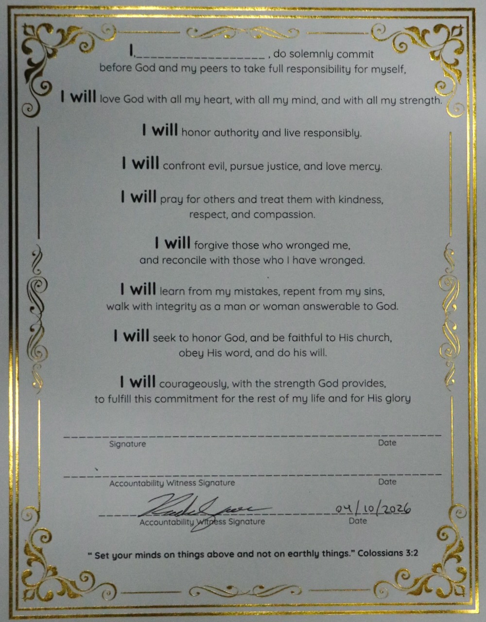 Today's (Friday) Week of Prayer service concluded with worship, reflection, and communion. After the theme song, Kaden Spare, sophomore class pastor, shared a message urging students to move beyond lukewarm faith, seek a deeper relationship with God, and embrace change. Students received a “Commitment to God” certificate to sign and share with a mentor, then came forward for a commitment prayer.