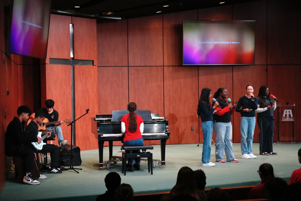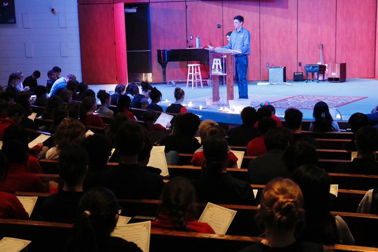 On Thursday, after the theme song, SA Pastor Sebastian Silie led a reflective prayer activity inviting students to write words describing their character on a mirror, revealing traits that reflect God’s nature. Kevin Mendonça then shared a message, telling three personal stories of poor choices and their consequences. He explained how ignoring opportunities to grow closer to God led him to become spiritually “lukewarm,” referencing Revelation 3 to show that lukewarm faith can be more dangerous than being cold. He reminded students that Jesus died for each person individually and that God is always “knocking” on their hearts, urging them to respond through prayer and personal choice. Chapel concluded with students coming forward for prayer, reflecting on their response to God’s call.