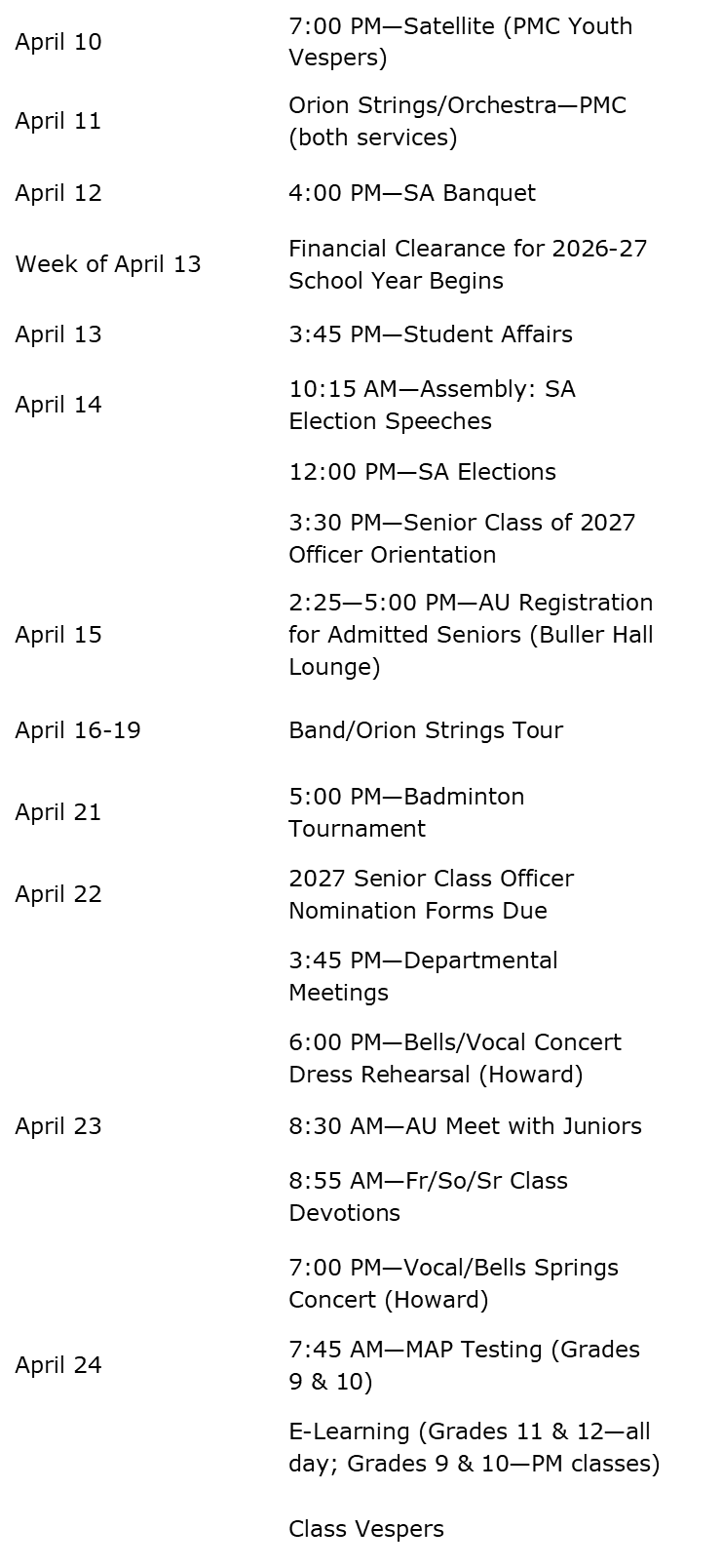 Tuesday’s chapel opened with the theme song Heart of Worship, followed by a prayer activity led by Ava Zygowiec, where students split into groups to pray for teachers, boys, and girls. Senior class pastor Elizabeth Dyman shared the story of “Riley,” a once-active churchgoer whose spiritual life declined after getting a smartphone and becoming consumed by social media. Though she stayed busy, she grew distant from God and settled into spiritual complacency. Elizabeth explained that constant busyness and social media can drown out the Holy Spirit, referencing Revelation 3:16–17. She urged students not to settle spiritually but to make small, intentional changes that can grow into a deeper relationship with Jesus. Chapel ended with everyone kneeling to sing All to Jesus I Surrender as a prayer, followed by a closing prayer from Elizabeth.