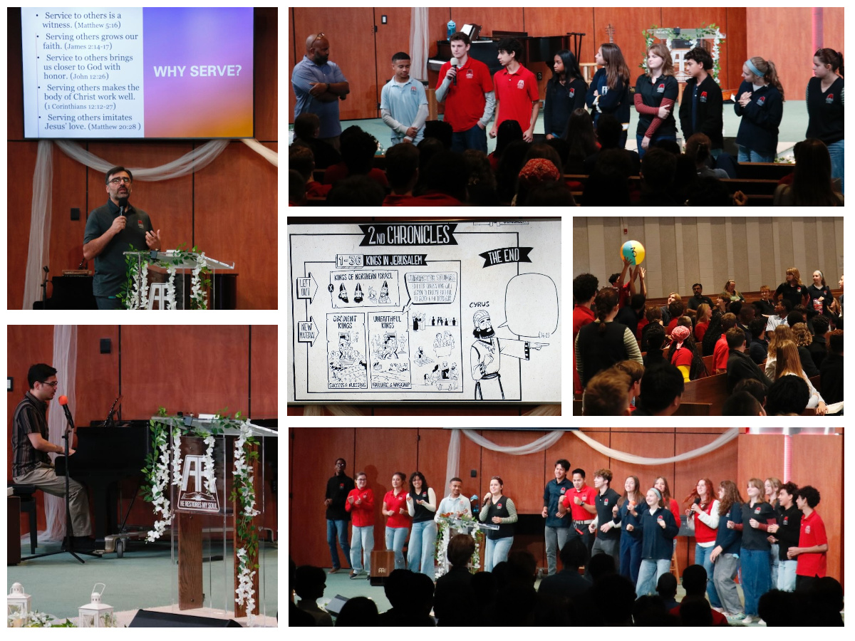 On Monday, Mr. Daniel Cerna, AA chorale/bells director, led the students in singing "We Are His Hands." Principal Perez-Schulz then gave a presentation on service, a core part of the school motto. He shared Bible verses emphasizing that service does the following: