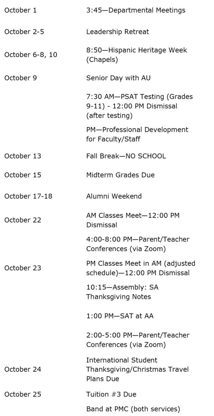 All freshmen, sophomores, and juniors will take the PSAT test on Thursday, October 9. We will dismiss at around 12:00 PM, with no lunch.