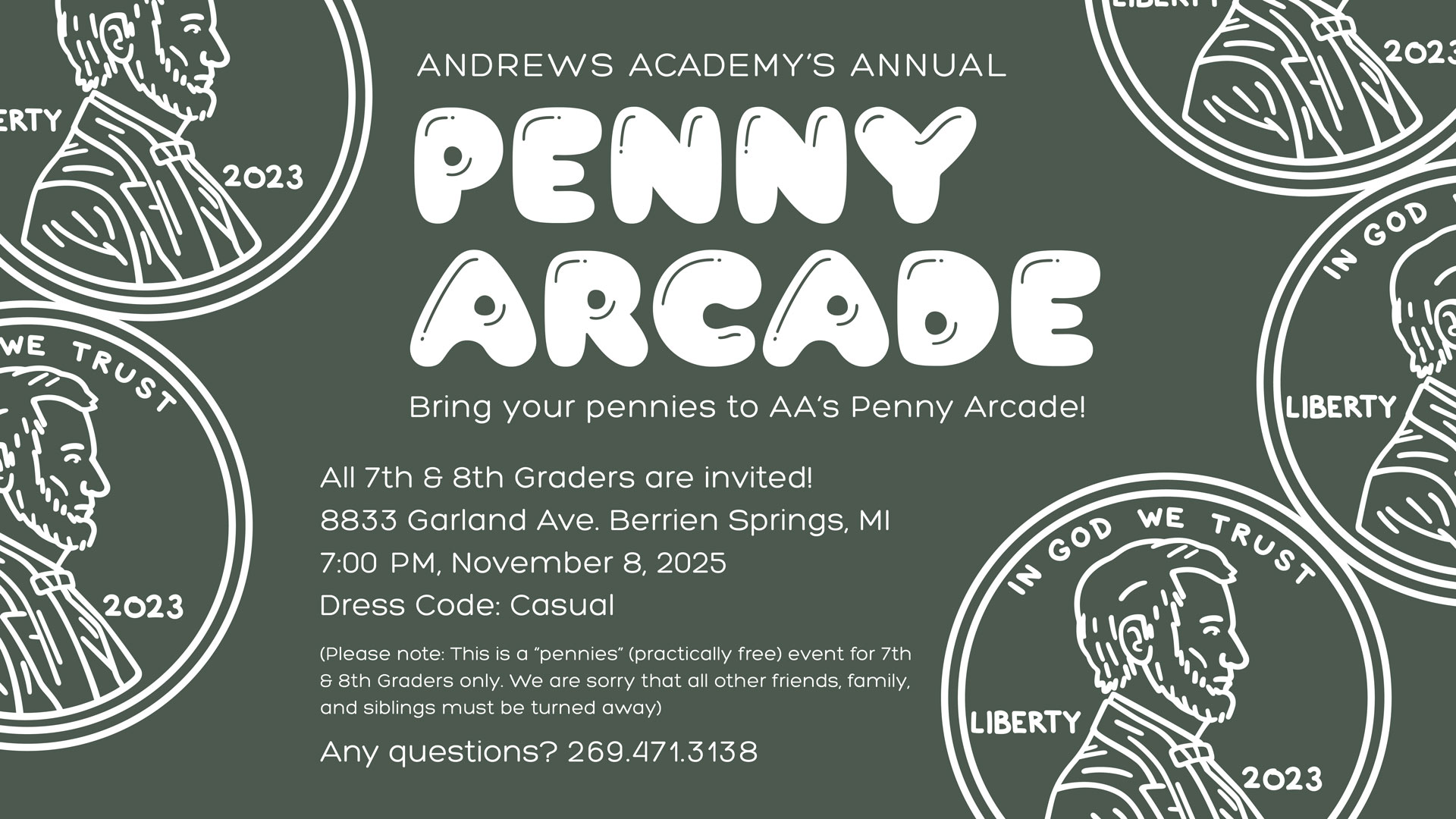All AA students are invited to attend Penny Arcade. They will be joined by 7th & 8th grade guests this Saturday evening, November 8, at 7:00 PM (those who are needed to help with set up can arrive at 6:00 PM).