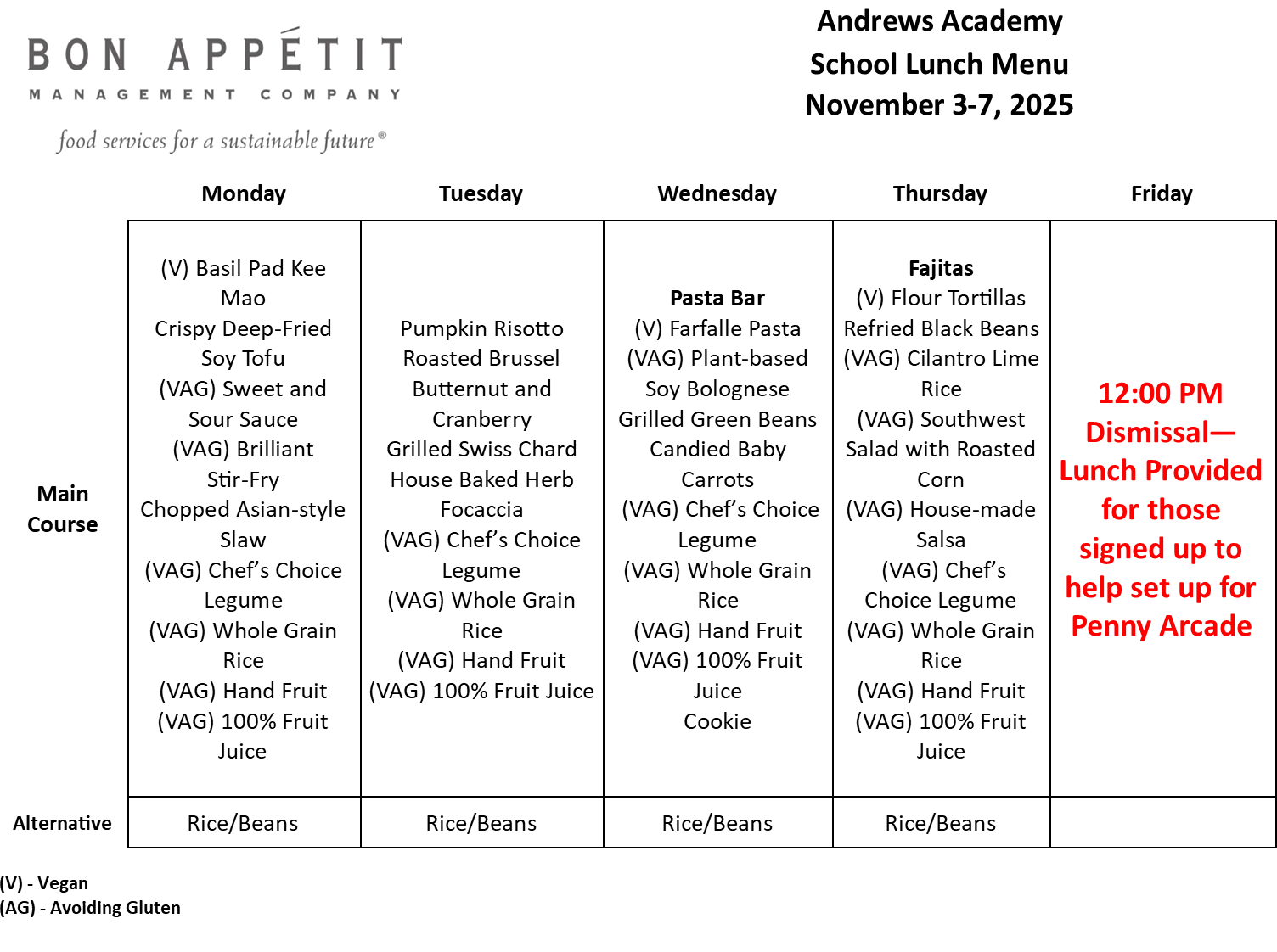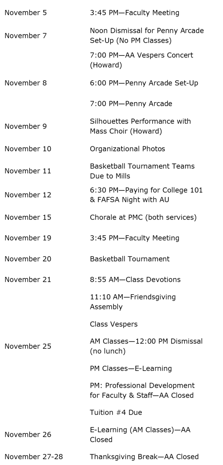This Friday, November 7, we will dismiss at 12:00 PM so that we can set up for Penny Arcade. Lunch will be provided only for those students who have signed up to help set up that afternoon.