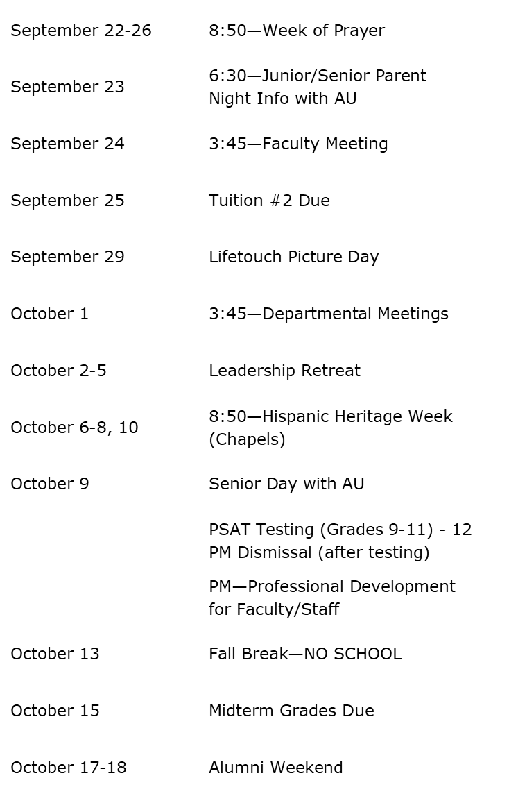 Payment #2 of 10 is due this Thursday, September 25. You may put your payment in the drop box on the post by the main doors if needed.