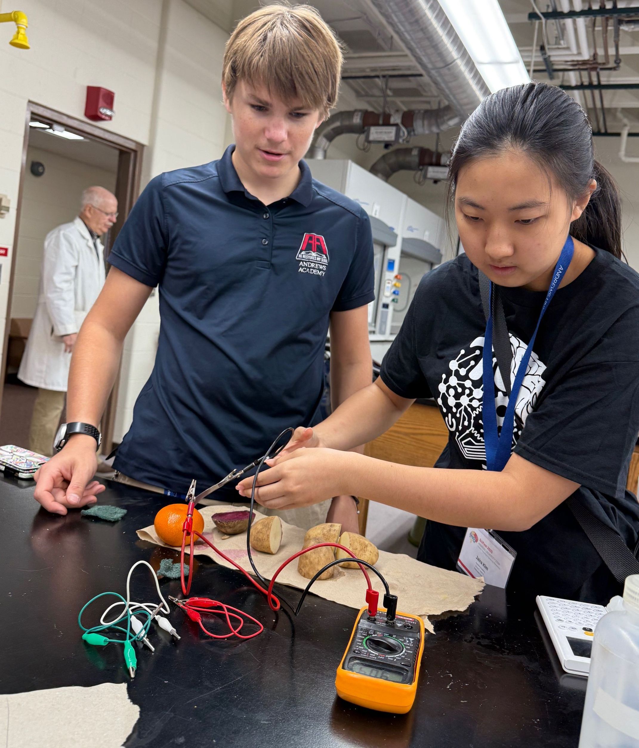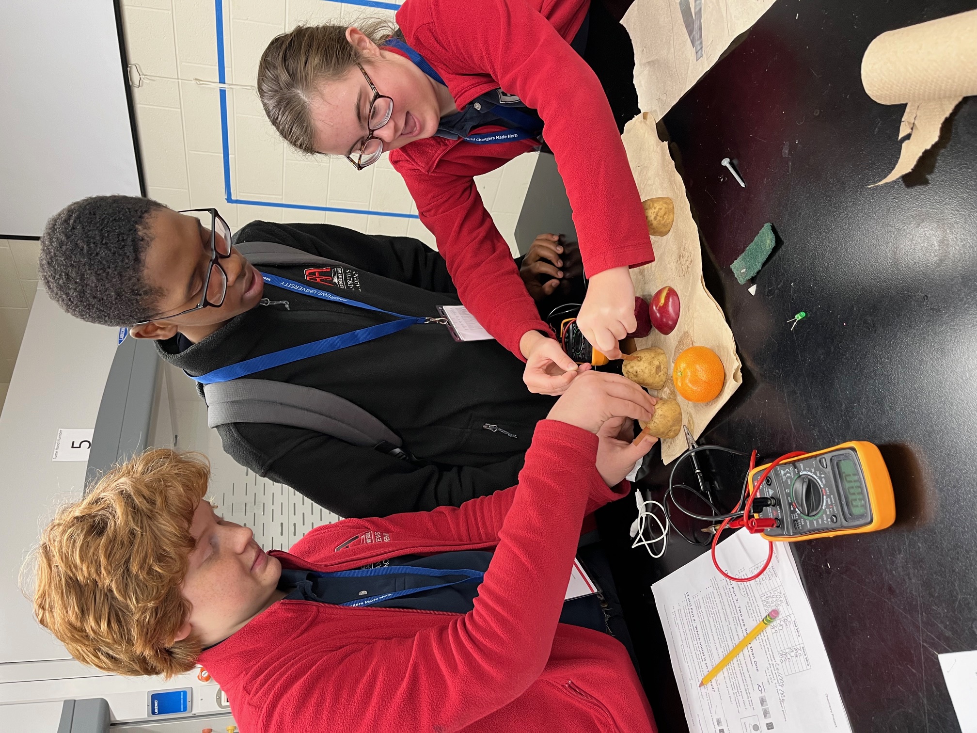 Chemistry - What makes a better battery, fruit or root vegetable? Students used metal strips and voltmeters to find the thing that makes the highest voltage.