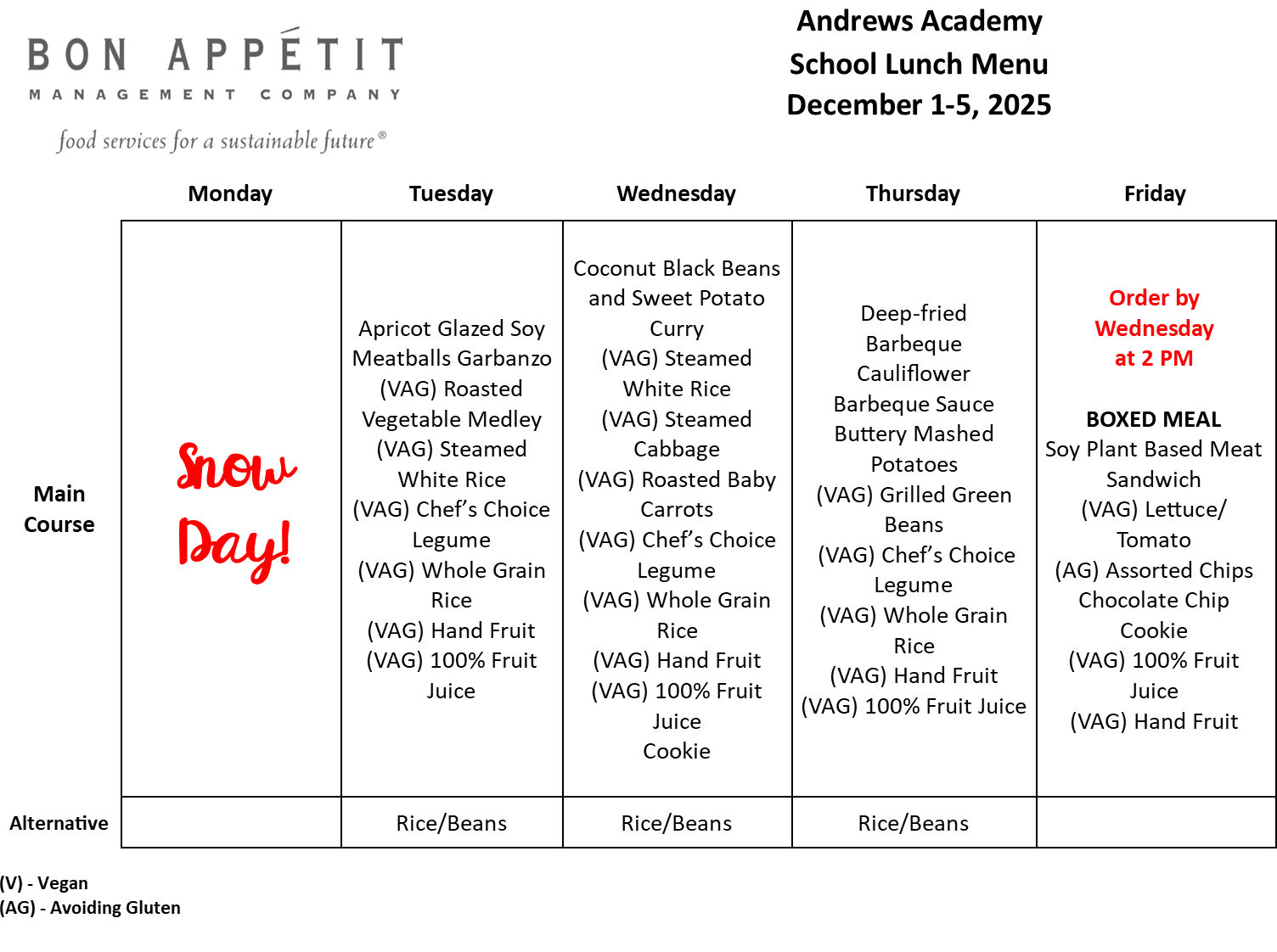 Attention Students: If you would like Friday's boxed lunch, those who are signed up for the lunch program must order it each week by Wednesday at 2:00 PM. The sign-up sheet will be at lunch or in the main office.